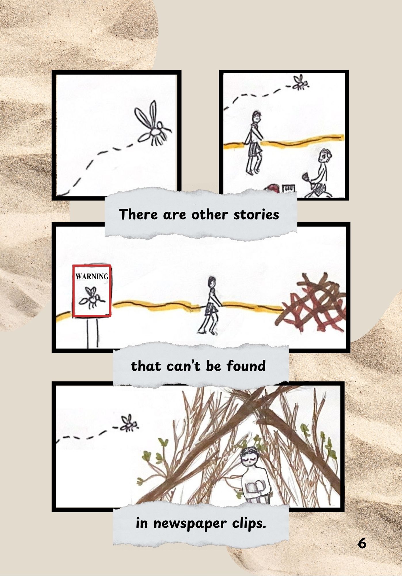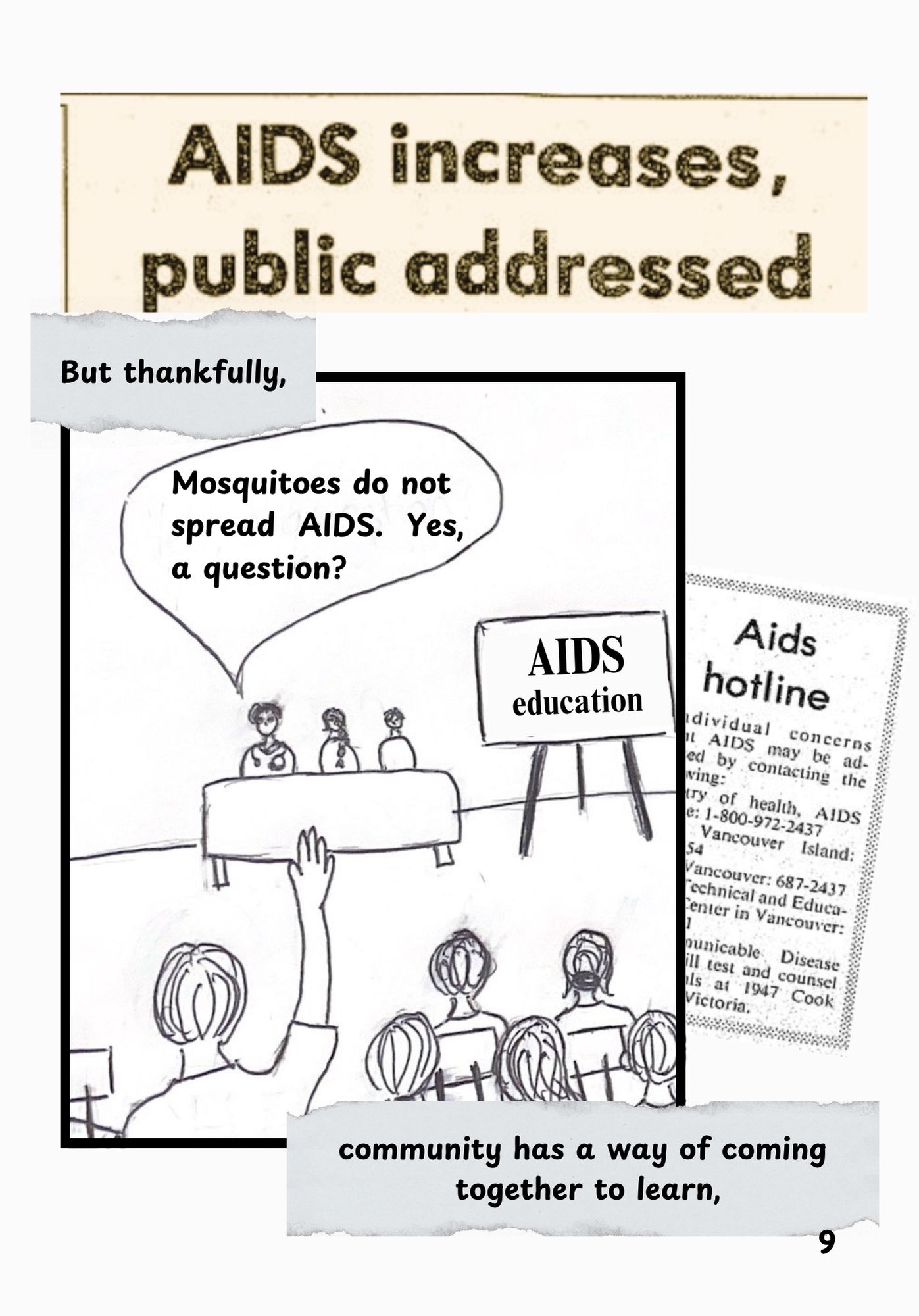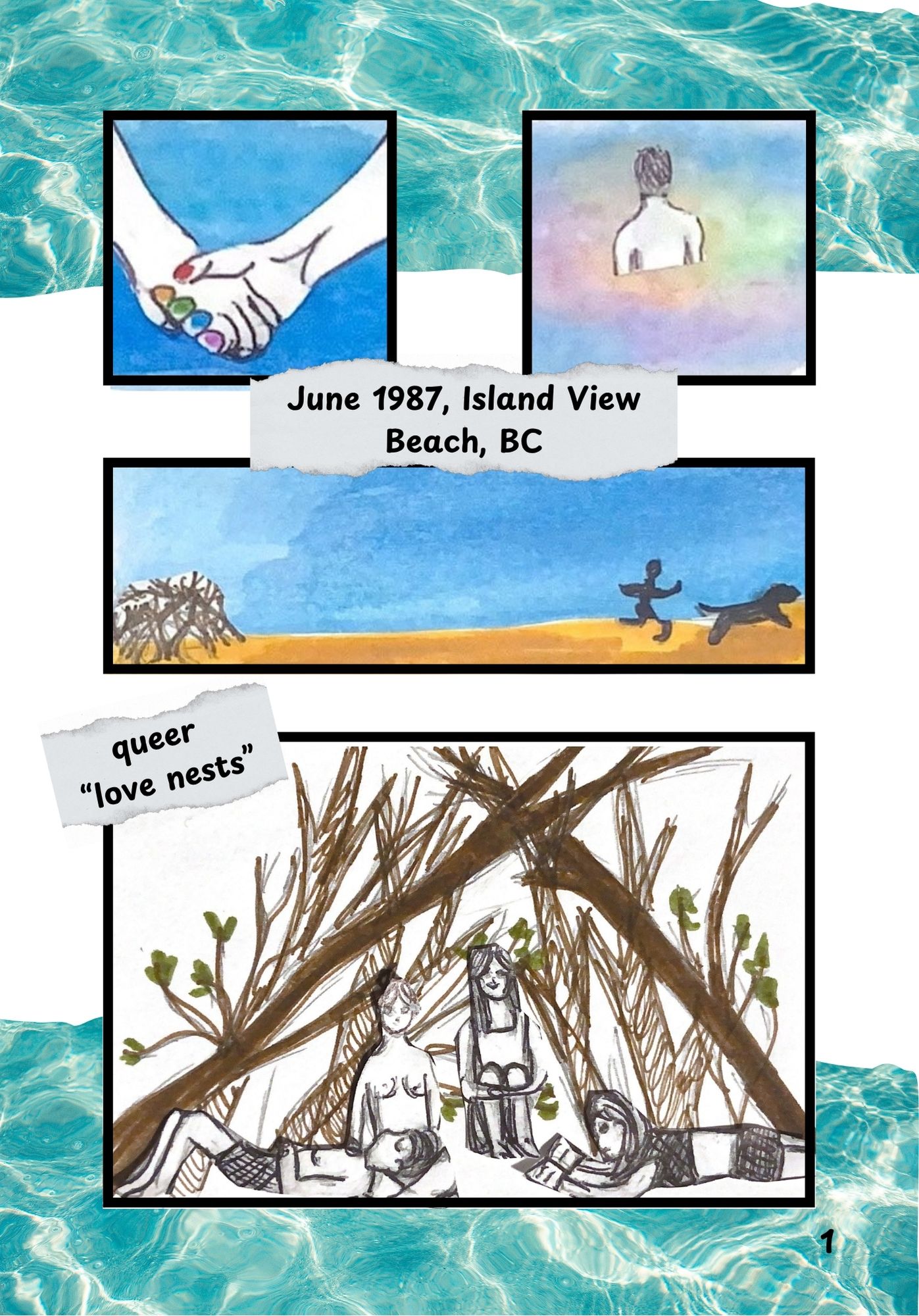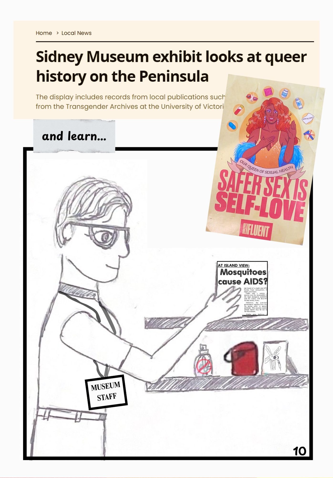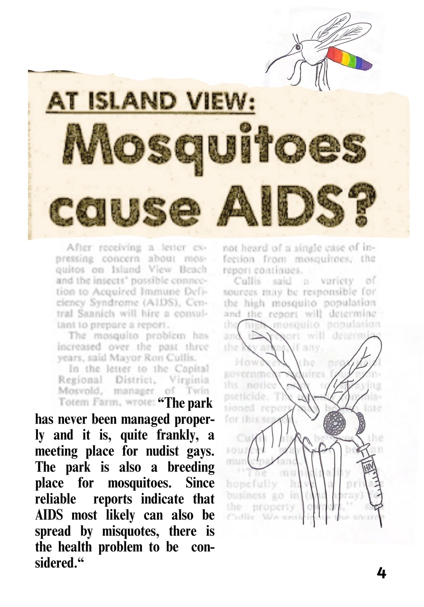 This is an original comic created in response to a story I uncovered at Island View Beach, while working at the Sidney Museum and Archives. Newspaper articles from the Peninsula Review pieced together a story of fear and misinformation about mosquitoes spreading AIDS. What peaked my interest was the “nudist gays” who went to the same beach the mosquitoes idea spread from. This comic attempts to shed light on their side of the story and reflect on the impact of this narrative on the community.